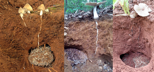 如果白蟻巢體上培養的是雞樅菌的菌絲體,當春天來臨、雷雨過后,蟻巢上方的土壤含水量增大,形成適當的溫差、濕差、氣壓差,巢體上就會形成原基,原基長高形成假根,假根穿過巢體上方的空間,進入巢體上方的土壤,土壤中含水量適宜,假根很快長出土面形成菌柄,菌柄頂端形成菌蓋。雨后空氣濕度大,適合菌柄和菌蓋的生長,在土面上就會突然長出大量雞樅菌的子實體。每年的5月至10月,只要我們不破壞蟻巢,不擾動、驚嚇白蟻,一個蟻巢可以連續出菇4至5批次。營養豐富的雞樅菌子實體為地面上的昆蟲以及人類提供了美味的食物。在一個很小的干重不到100克的蟻巢體上,就可采集到500克以上的鮮菇,這個出菇行為會大量消耗白蟻所需要的營養物質。